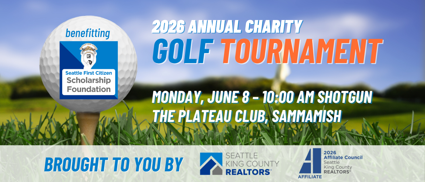 Bring your friends, colleagues, clients, and families to the Annual Charity Golf Tournament on June 8! The 18-hole scramble is sponsored by Affiliate members of Seattle King County REALTORS®. Registration includes lunch, snacks, tickets to the banquet, and a golf cart!